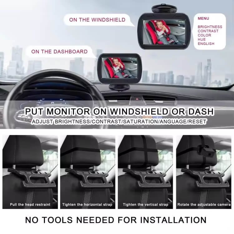 High-Definition and Impressive Picture: The baby car monitor with a camera uses the latest chip technology with automatic color adjustment, allowing you to see your baby more clearly in the back seat. The car baby camera provides real-time images and is easy to set up. You can adjust the brightness, contrast, hue, saturation, language, and reset options via the buttons on the car seat rearview camera. this baby essentials  is a must-have for every mom.