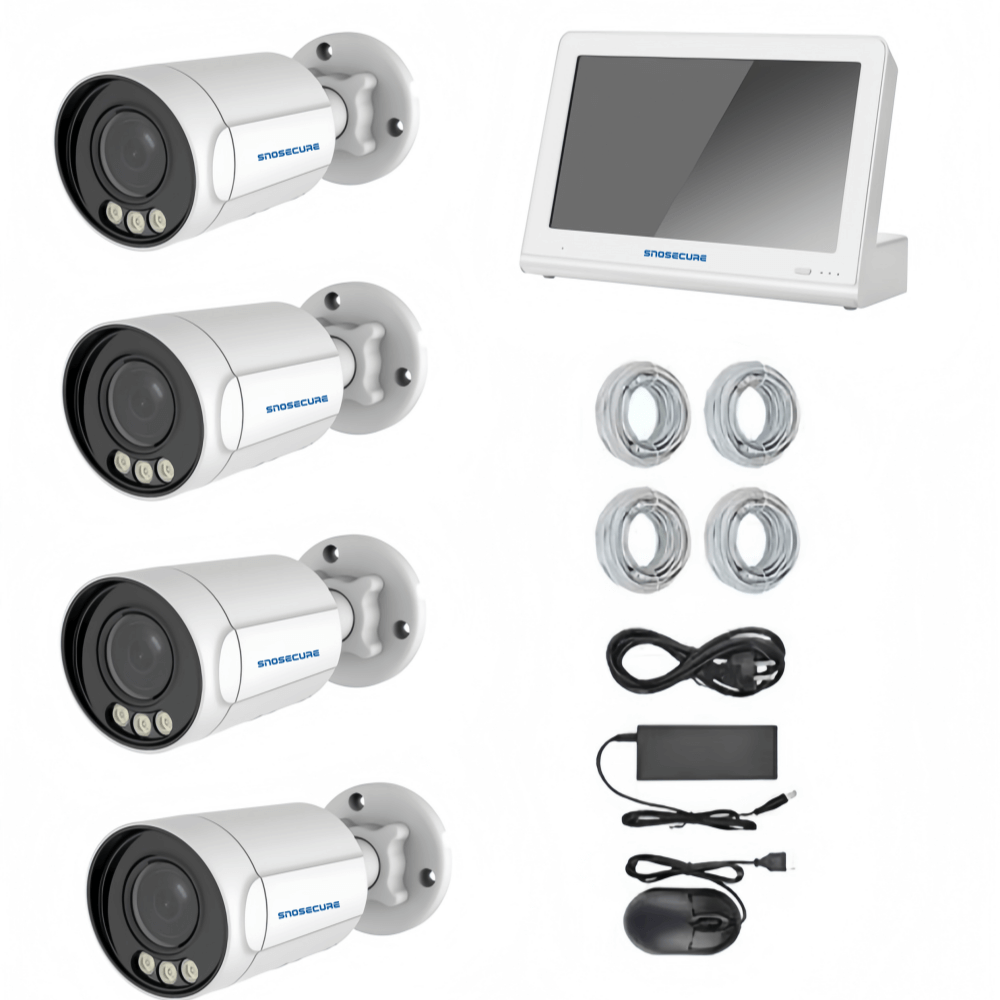 This 4ch 4K 8MP PoE CCTV Bullet Security Camera System includes an 11.6-inch monitor and NVR kit for complete video surveillance. Featuring audio recording, AI human detection, smart dual-stream technology, and superior night vision, it ensures reliable protection for homes and businesses day and night.