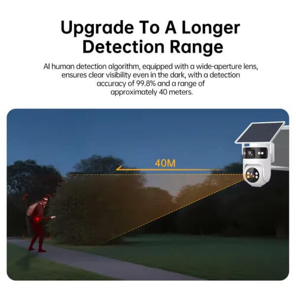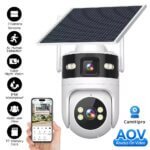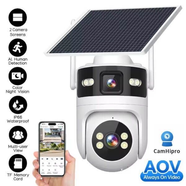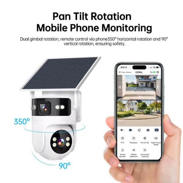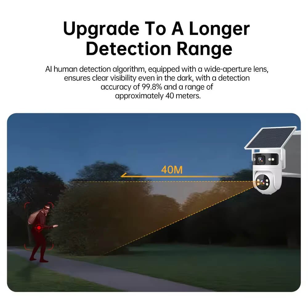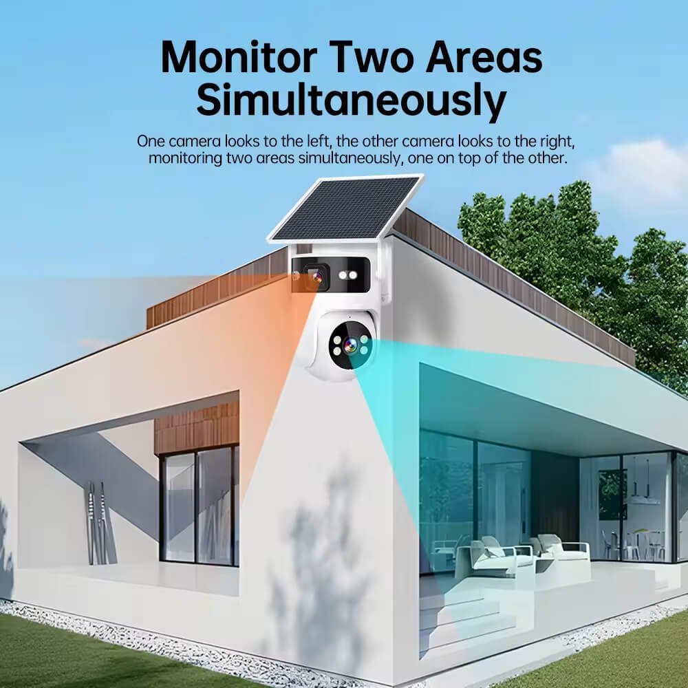 The SNOSECURE 4G solar PTZ security camera features a dual-lens design for wider coverage and enhanced monitoring. Equipped with AI human detection, full-color night vision, and IP66 waterproof protection, it delivers reliable outdoor surveillance with remote access via Camhipro APP.